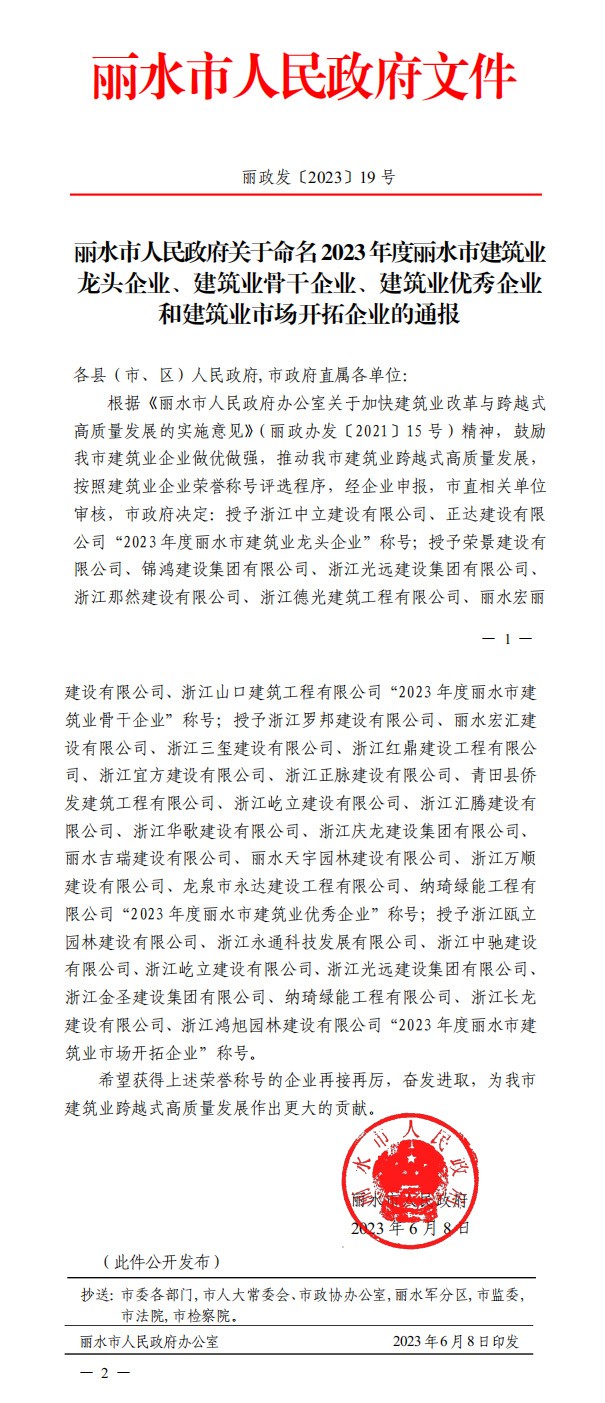 近日,麗水市人民政府通報(bào)了2023年度建筑業(yè)企業(yè)榮譽(yù)稱號(hào)評(píng)選結(jié)果,共有31家企業(yè)榮獲了麗水市建筑業(yè)企業(yè)榮譽(yù)稱號(hào)。