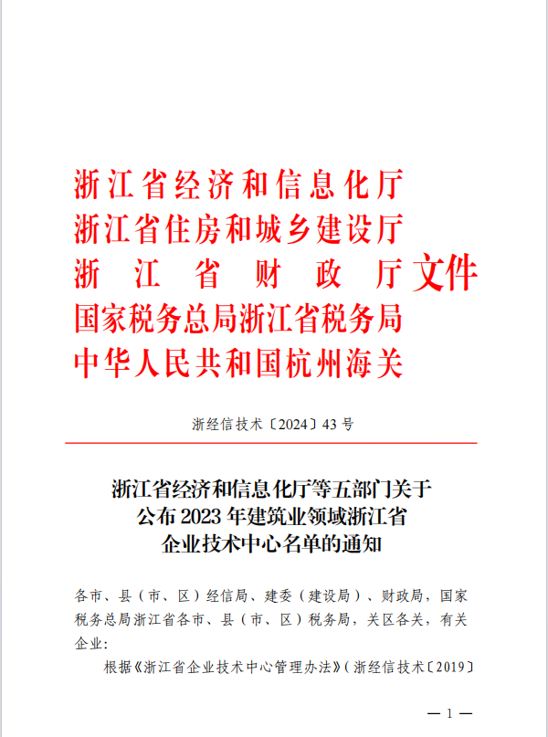 近日,浙江省經(jīng)濟(jì)和信息化廳等五部門(mén)公布2023年建筑業(yè)領(lǐng)域浙江省企業(yè)技術(shù)中心名單的通知,我公司企業(yè)技術(shù)中心榮獲2023 年建筑業(yè)領(lǐng)域浙江省企業(yè)技術(shù)中心認(rèn)定。