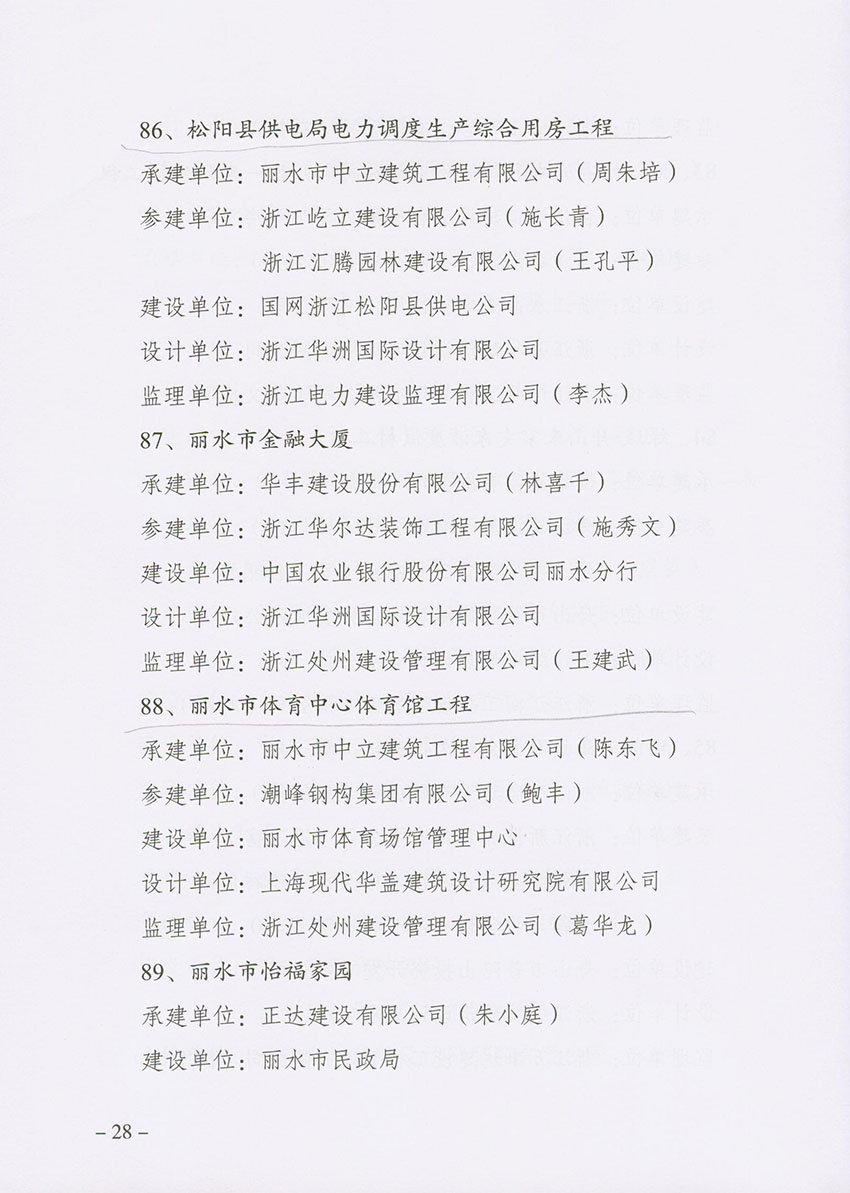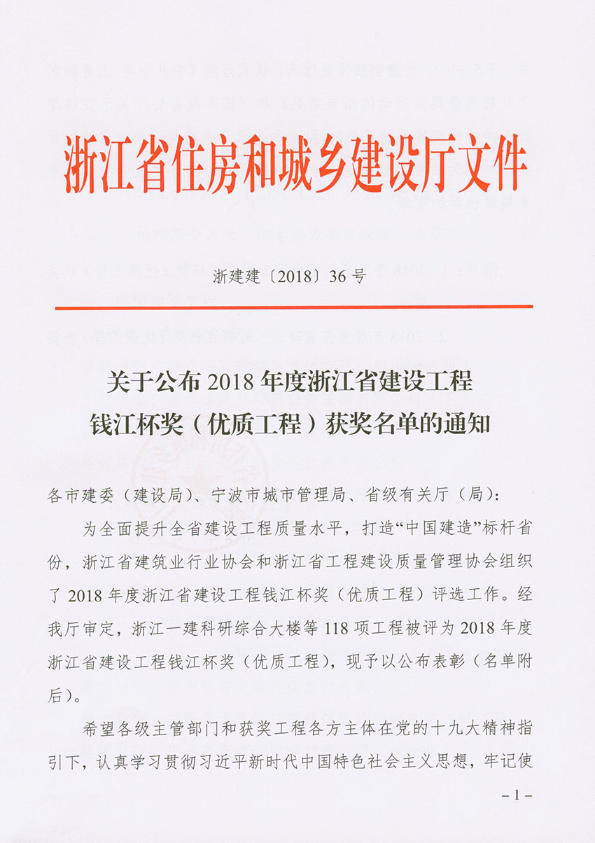 喜報!近日,省建設(shè)廳頒發(fā)了2018年度浙江省建設(shè)工程“錢江杯”(優(yōu)質(zhì)工程)文件,我公司“麗水市體育館體育中心工程、松陽縣供電局電力調(diào)度生產(chǎn)綜合用房工程”分別獲得2018年度“錢江杯”(優(yōu)質(zhì)工程)獎。