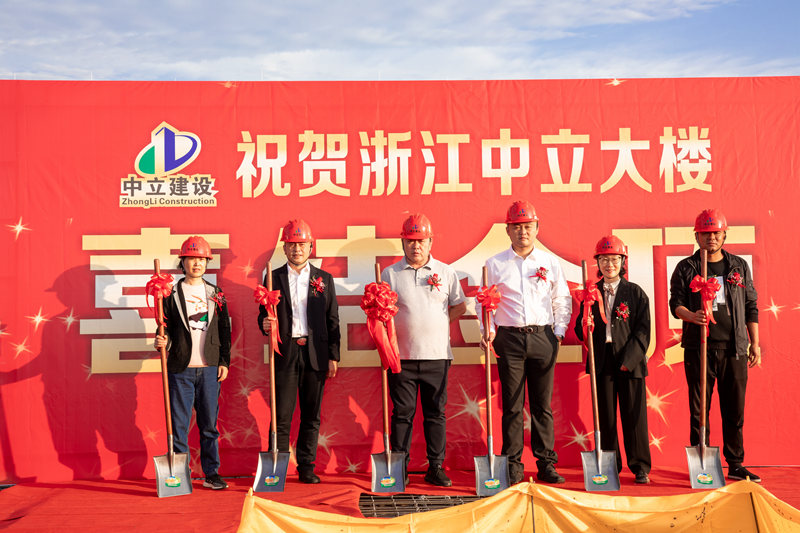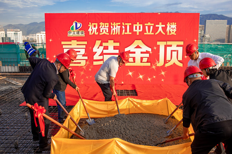 公司董事長周國強、副董事長周健、總經(jīng)理鐘鳴、副總經(jīng)理池甘萍、副總經(jīng)理葉麗紅等人共同拿起鐵鍬,為中立大樓澆筑結頂,迎來了歷史性的時刻。