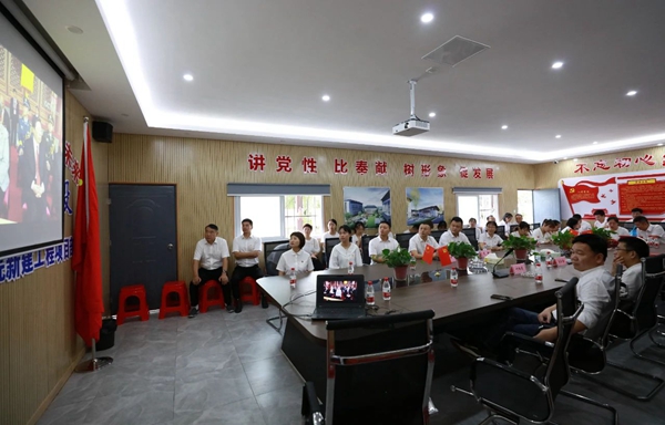 支部建在工地上!7月1日,公司黨支部書記鐘鳴、董事長周健帶領(lǐng)全體黨員、高層人員來到麗水電大蓮都學(xué)院新建工程項(xiàng)目,首先和項(xiàng)目工作支部全體黨員觀看慶祝中國共產(chǎn)黨成立100周年大會直播實(shí)況。
