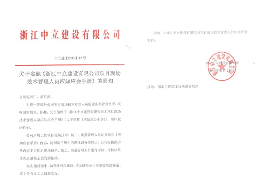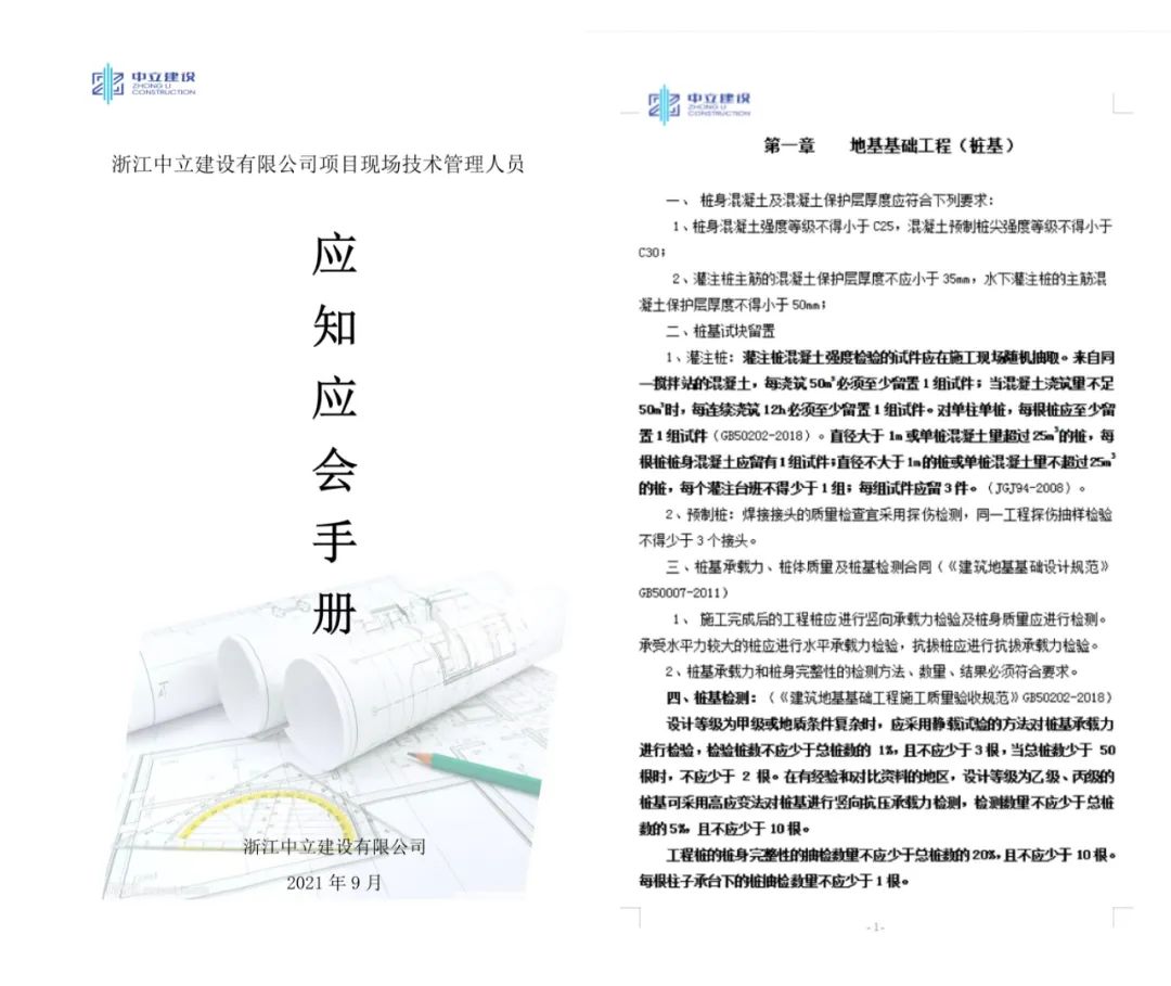 為進(jìn)一步提升公司項(xiàng)目現(xiàn)場(chǎng)技術(shù)管理人員的整體業(yè)務(wù)和管理水平,積極開展“質(zhì)量月”活動(dòng),根據(jù)國(guó)家標(biāo)準(zhǔn)規(guī)范,中立建設(shè)編制了《浙江中立建設(shè)有限公司工項(xiàng)目現(xiàn)場(chǎng)技術(shù)管理人員應(yīng)知應(yīng)會(huì)手冊(cè)》,并于9月23日發(fā)文實(shí)施。這是繼今年6月份我公司出臺(tái)的《工程質(zhì)量通病防治(2021試行)》后的又一重要技術(shù)性手冊(cè)。
